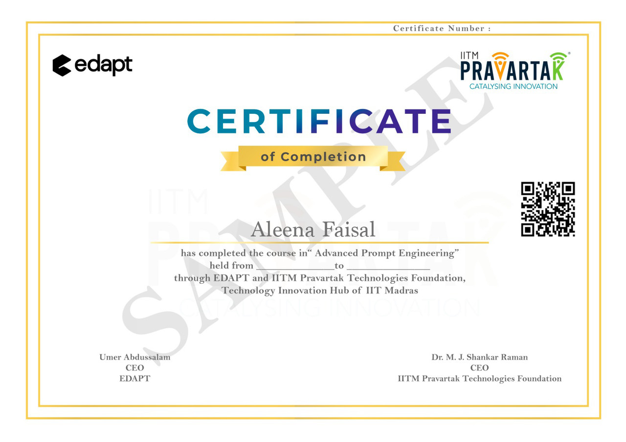 View moreI completed the Advanced AI Prompt Engineering & Automation Mastery for Professionals course. It was fantastic it opened up a horizon of new opportunities for me. The techniques I learned have made both my work and personal tasks easier, and I'm grateful to Edapt for offering such an effective, excellent-value program.